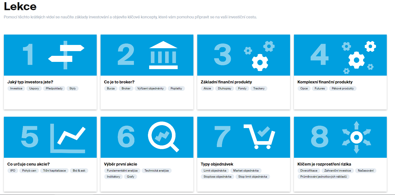 Na stránkách DEGIRO lze nalézt také sekci nazvanou Investiční akademie. Ta člověka pomocí krátkých videí seznámí se základními principy investování. Pokud patříte mezi začínající investory, pak jejich shlédnutí můžu jedině doporučit!