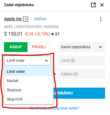 Při nákupu akcií nebo ETF máme na výběr ze čtyř typů objednávek (viz obrázek). Pro začátek nám budou stačit pouze Limit order a Market. Jaký je mezi nimi rozdíl?