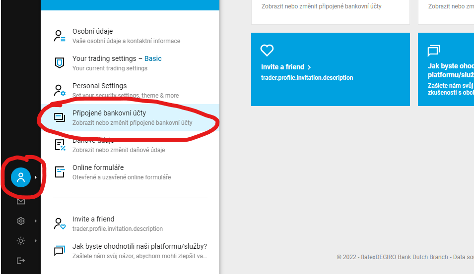 Při vkládání peněz je důležité si dát pozor na dvě věci. Zaprvé, vklad je nutné vždy posílat z bankovního účtu uvedeného při registraci na DEGIRO. Pokud nevíte jaký účet to byl, dá se to jednoduše zjistit v našem profilu (viz obrázek níže ⬇️). Zadruhé, DEGIRO používá rozdílné účty pro vklady CZK a EUR. Pro co nejrychlejší vyřízení našeho vkladu je vhodné poslat peníze na ten správný.